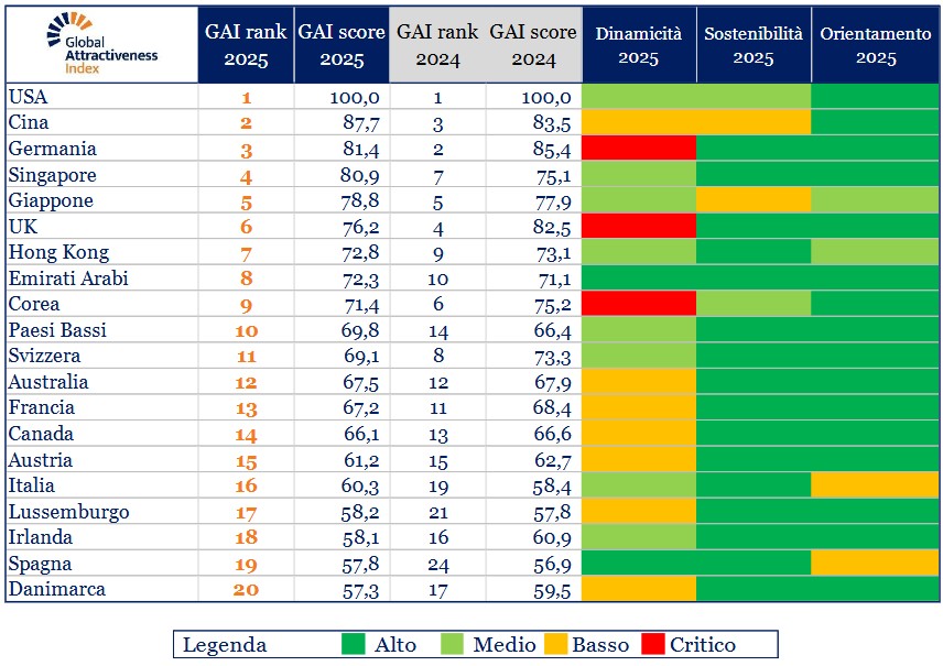 E’ in questo contesto di rapporti internazionali imprevedibili – con le guerre in Ucraina e Palestina – che la presentazione dei risultati del Global Attractiveness Index 2025 (Gai Index, realizzato da The European House – Ambrosetti) apre uno “spiraglio” all’Italia, seppure insufficiente. In una classifica dominata dagli Stati Uniti che si confermano sempre al primo posto (score pari a 100) seguiti da Cina (87,7) e Germania (81,4).