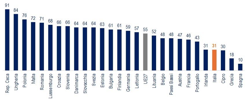 Al 3° posto siede la Germania, che ha ridotto il suo indice dal 91,0 del 2023, all’85,4 del 2024, fino all’81,4 quest’anno, dovuto alla stagnazione industriale, con un rallentamento sia della domanda interna sia delle esportazioni.